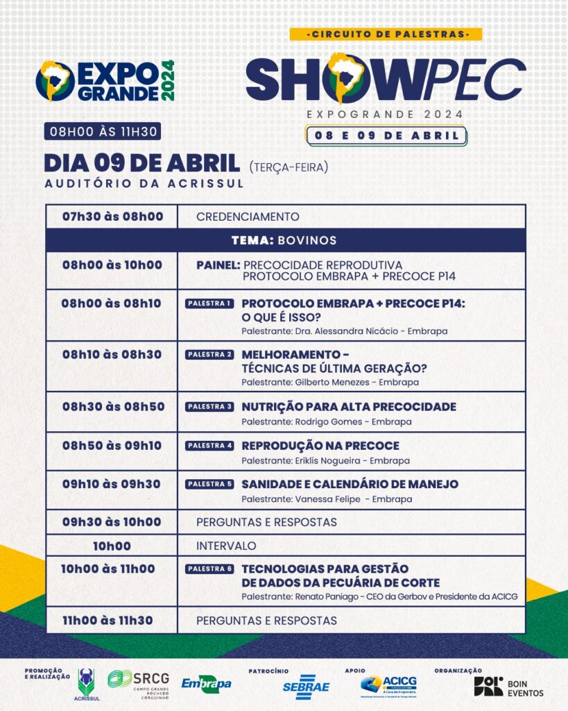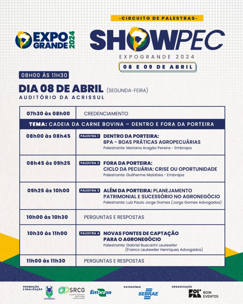 No auditório da Acrissul, no dia 8, a cadeia produtiva da carne bovina será o assunto principal do Showpec, com a pesquisadora Mariana Aragão abordando o Programa de Boas Práticas Agropecuárias (BPA); o pesquisador Guilherme Malafaia, as crises ou oportunidades do ciclo da pecuária; e o planejamento patrimonial e sucessório com o especialista Luiz Paulo Gomes.